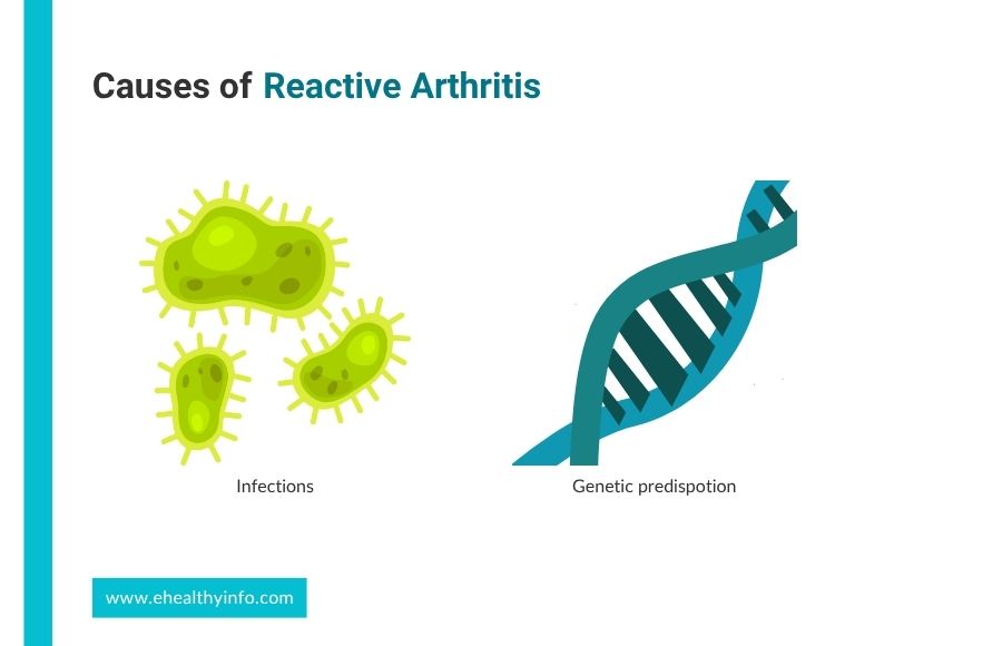 - Genetics: Reactive arthritis is often linked to genetics, with the HLA-B27 gene being a major risk factor. Around 50-80% of people with reactive arthritis carry this gene, but not everyone with HLA-B27 develops the condition. A family history of HLA-B27-associated diseases also raises the risk, highlighting the genetic influence on reactive arthritis. [4]