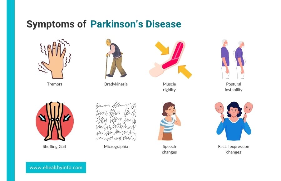 Parkinson’s disease primarily affects movement. Its symptoms often develop gradually over time, varying from person to person. The symptoms of Parkinson’s disease include: