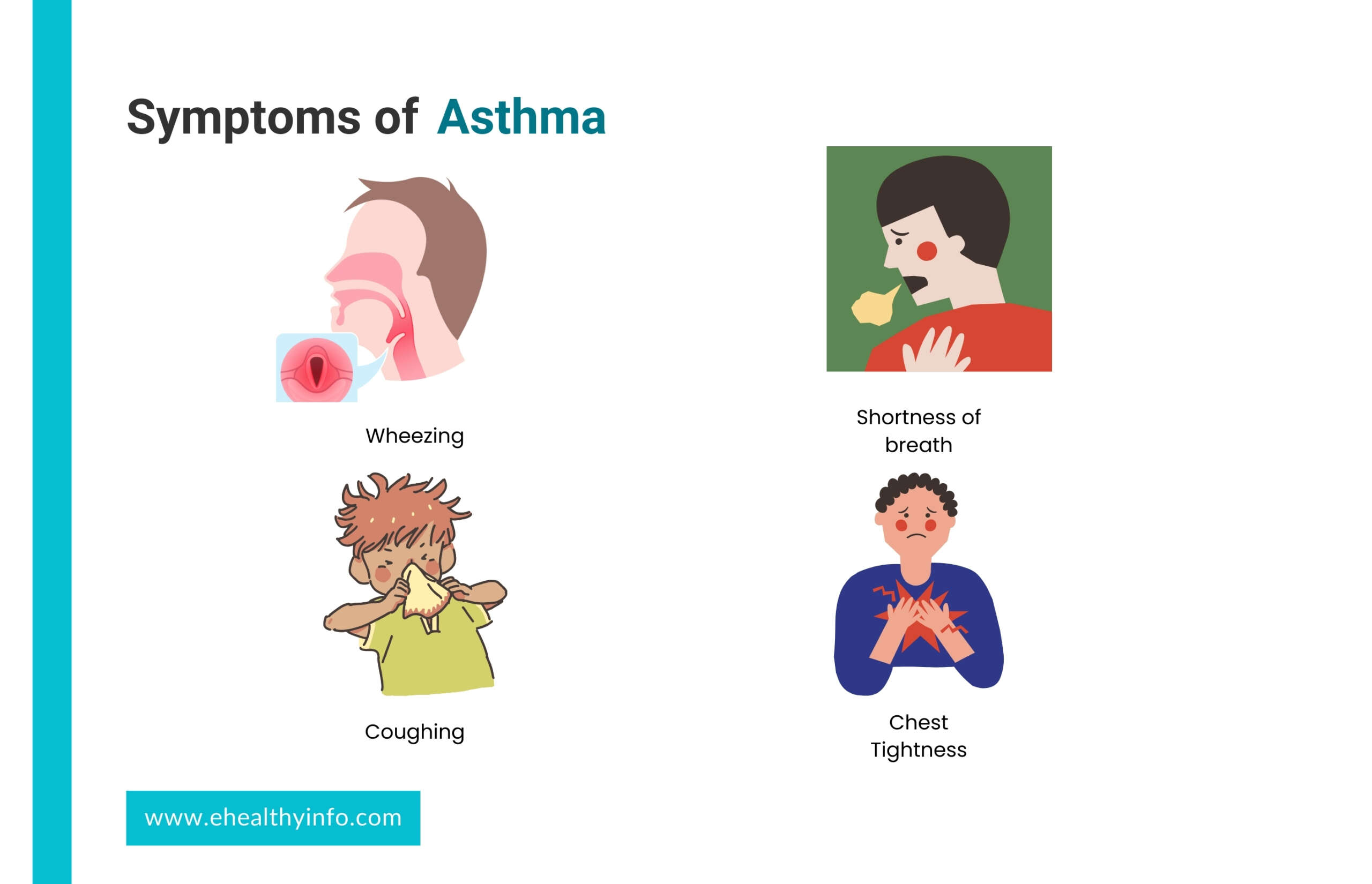 Common asthma symptoms include wheezing (a whistling sound when breathing), coughing (especially at night or during exercise), shortness of breath, chest tightness, and a feeling of being unable to take a deep breath.